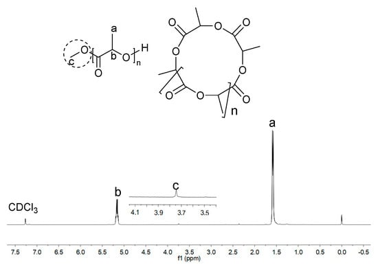 In order to gather more information about the mechanism of the ROP of L-LA, the obtained PLLA (run 18, Table 2) was characterized by a 1H NMR and MALDI-TOF spectrum. The MALDI-TOF mass spectrum revealed two families of peaks (as shown in Figure 6): both A/A* and B/B* were separated by an m/z of 72, in which the major peaks A/A* can be ascribed to CH3OH + (C3H4O2)n + Na+/K+ and the minor peaks B/B* are assignable to (C3H4O2)n + Na+/K+. The 1H NMR spectrum clearly showed the presence of CH3O protons around δ 3.75 ppm (shown in Figure 7), which may come from the methanolysis of the polymer chain during the quenching process [60,67,68]. In addition, there was no signal of -N(SiMe3)2 in either the 1H NMR or MALDI-TOF spectra, which was consistent with a previous report in the literature [51].