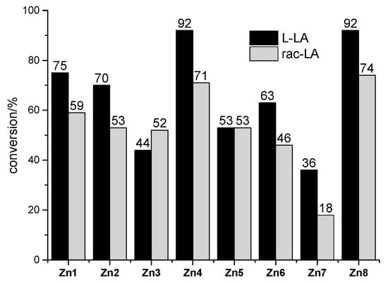 Comparison of the monomer conversions (L-LA and rac-LA) achieved using Zn1–Zn8/2LiN(SiMe3)2.
