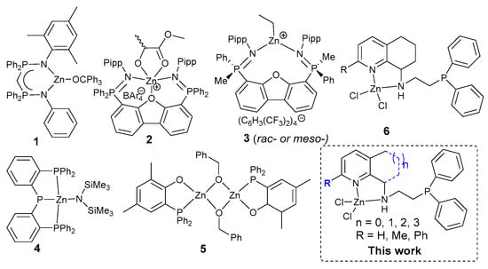 As described above, the ligands of zinc-complex precatalysts commonly contain nitrogen and/or oxygen donors [17,18,19,20,21,22,23,24,25,26,27,28,29,30,31,32,33,34,35,36,37,38,39,40]. In addition, there have been a few reports on the ROP of LA with zinc complexes containing a phosphorus group. For example, zinc complex 1 (Scheme 1), including a bis(phosphinimino)methyl ligand, catalyzed 100 equivalent rac-LA with a > 95% conversion rate within 2 h in toluene at 60 °C [41]. A series of cationic zinc complexes (2 and 3, Scheme 1) supported by bis(phosphinimine) ligands performed well in the ROP of rac-LA [42,43,44,45]. Zinc complex 2 (Scheme 1) achieved the ROP of rac-LA with 90% conversion in 50 min at ambient temperature at the molar ratio of [rac-LA]/[2] = 200:1, characterized by a slightly hetero-enriched microstructure [polymer tacticity (Pr) = 0.63] [42]. Meanwhile, the cationic alkyl zinc complexes rac-3 and meso-3 (Scheme 1), as isolatable stereoisomers, individually catalyzed 1000 equivalent rac-LA monomers at 40 °C, resulting in PLAs with 89.6% conversion by rac-3 in 4 h and 95.3% conversion by meso-3 in 3.8 h, more importantly observing a higher molecular weight in PLA of 3.90 × 105 g/mol [45]. Moreover, zinc complex 4 (Scheme 1), bearing a diarylphosphido-diphosphine, also efficiently initiated the ROP of L-LA with a 91% yield in the presence of isopropyl alcohol in toluene within 20 min with [L-LA]/[4] = 200 [46]. The extensive copolymerization of L-LA and ε-caprolactone (ε-CL) proceeded smoothly at 110 °C for random copolymers [47]. Another P^O-phosphinophenolate zinc complex 5 (Scheme 1) polymerized 100 equivalents of rac-LA with a 97% conversion rate in CH2Cl2 after 2 h and showed a good capability of catalyzing the homo(co)-polymerization of L-LA or ε-CL and trimethylene carbonate (TMC), achieving PCL/PTMC-co-PLLA co-polymers and PTMC-co-PCL-co-PLLA terpolymers [48].