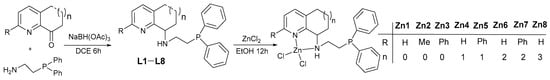 A series of ligands L1–L8 of monocycloalkyl (ring size from five to eight)-fused pyridine-bearing pendant N-diphenylphoshinoethyl groups, N-(Ph2PCH2CH2)-2-RC7H7N-8-NH (R = H L1, R = Ph L2, R = Me L3), N-(Ph2PCH2CH2)-2-RC9H9N-8-NH (R = H L4, R = Ph L5), N-(Ph2PCH2CH2)-2-RC10H11N-8-NH (R = H L6, R = Ph L7), N-(Ph2PCH2CH2)-2-RC11H13N-8-NH (R = H L8), were prepared according to the literature (as shown in Scheme 2) [53,54,55]. The Zn(II) complexes Zn1–Zn8 were obtained by treating the ligands L1–L8 with zinc(II) chloride in ethanol at room temperature for 12 h, respectively. All novel compounds were confirmed by 1H, 13C and 31P NMR (shown in Figures S1–S36), FT-IR spectroscopy and elemental analysis. The 31P NMR spectrum of ligands showed one signal around −20 ppm, while their corresponding zinc complexes showed a shift around −22 ppm. These little shifts changes in the 31P NMR spectra indicated little environmental change around phosphine, and also suggesting the possible dissociation of phosphine to zinc. Subsequently, the structures of Zn2, Zn3, Zn7 and Zn8 were further determined by single-crystal X-ray diffraction, which agreed well with their 31P NMR spectra.
