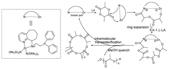 Based on the above results, the mechanism of the ROP of L-LA catalyzed by Zn1–Zn8/2LiN(SiMe3)2 was proposed, as shown in Scheme 3. It is assumed that a Lewis pair will form during the ROP process and can be ‘loosened up’ at higher temperatures to form a zwitterionic intermediate. Subsequently, this ‘loose’ pair can initiate the polymerization, causing the ring to expand to form the cyclic macrolactone metal ring; this mechanism has also been reported in the literature [51,69,70]. Finally, methanol was added to terminate the polymerization reaction, and a linear polymer capped with a methoxyl group was obtained [71]. Furthermore, its minor cyclic structure may be due to intramolecular transesterification.