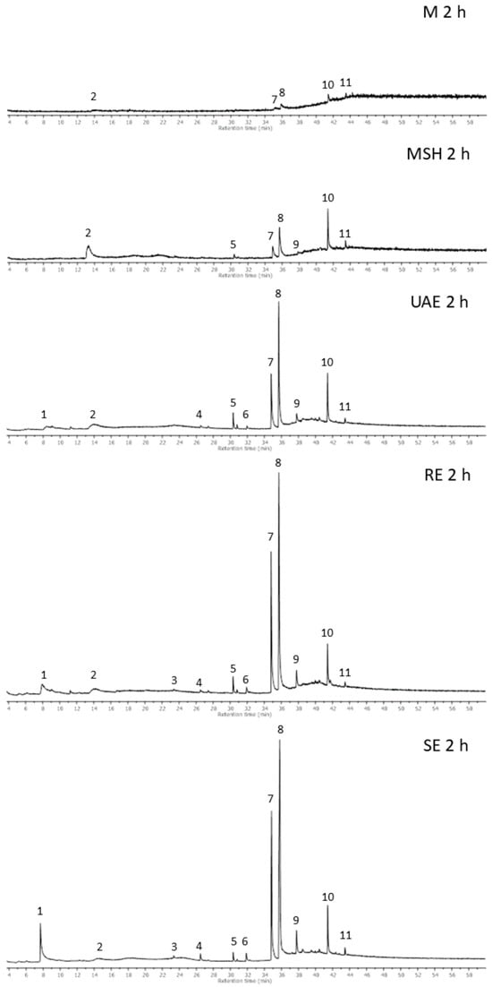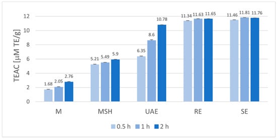 Statistical analysis of the data showed that, for the particular time variants (0.5 h, 1 h, or 2 h), the differences in the antioxidant potential expressed as RSA (Table 1) and TEAC (Figure 1) between the various extraction techniques used were significant (p ≤ 0.05). The only exception was a statistically insignificant difference between the antioxidant properties of the extracts obtained in 0.5 h processes using the RE and SE techniques (p = 0.202). If we consider the individual extraction techniques, the antioxidant potentials of extracts obtained after 0.5 h, 1 h, and 2 h differed significantly in the case of M, MSH, and UAE techniques (p < 0.05). No significant differences were found in the antioxidant potential of extracts obtained after 1 h and 2 h using the RE and SE methods, (p = 0.874 and p = 0.325, respectively).