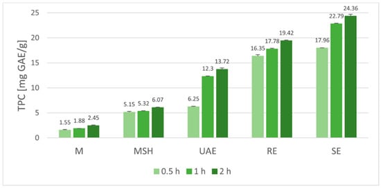 In the case of the total phenolic contents (Figure 2), statistical analysis of the data showed that, for all particular time variants (0.5 h, 1 h, and 2 h), the differences between TPC for the extracts obtained by the various extraction techniques were significant (p < 0.05). Importantly, considering the individual techniques of extraction, data for the extracts obtained after 0.5 h, 1 h, and 2 h differed significantly (p < 0.05) for each applied method (Figure 2).