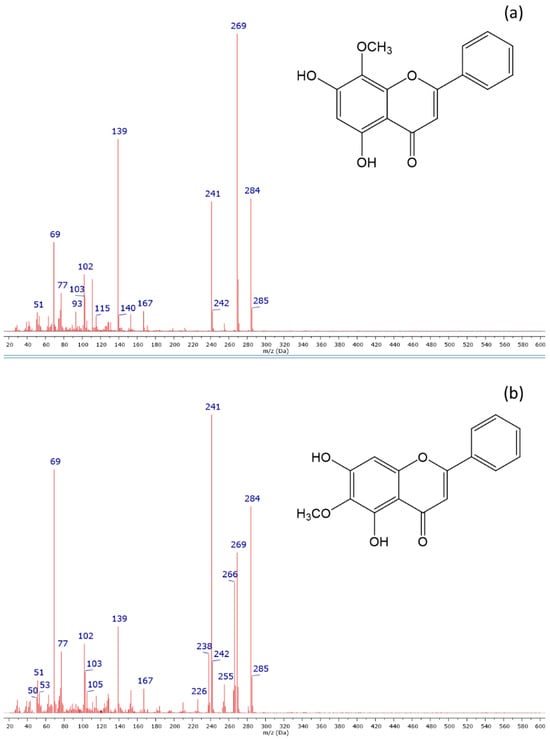 Mass spectra of wogonin (a) and oroxylin A (b) identified in ethanolic extracts of Baikal skullcap (S. baicalensis) root.