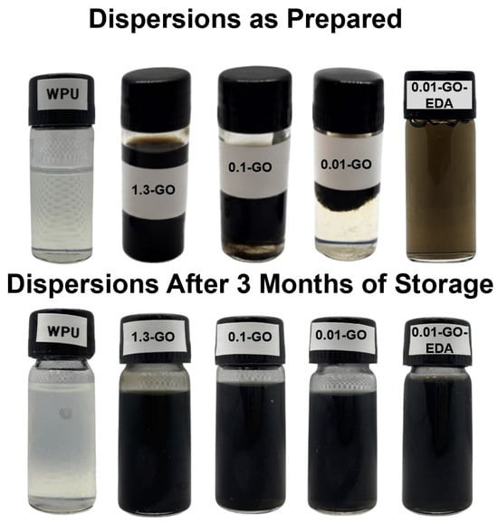 To evaluate the stability of GO in the WPU resins, the dispersions were stored for three months. Figure 2 shows photographic images of the WPU resin and GO dispersions in WPU at various concentrations, both immediately after preparation and after three months of storage. After these months, a characteristic black color was observed in the dispersions, which can be attributed to the mild partial reduction of the GO to rGO, as also observed by Otsuka et al. for GO aqueous colloidal suspension after seven days [46]. All samples remained stable except for 0.01-GO and 0.1-GO, likely due to their low GO concentrations. However, mechanical agitation restored 0.1-GO stability. The functionalization with EDA was performed to promote the better dispersibility of GO sheets on the WPU matrix for the 0.01-GO sample. The EDA can interact with GO by hydrogen bonding and/or as a cross-linking agent between the GO sheets since the two terminal amino groups (-NH2) can covalently bind to the carboxyl groups of GO sheets, promoting a higher dispersion of GO sheets into the WPU matrix [47]. This potentially improves the nanocomposite’s barrier properties [47,48]. Additionally, since EDA acts as a hardener for the polyurethane resin, it may enhance the mechanical resistance of the material. However, it is crucial to use the appropriate amount (low content) of this chain extender to achieve optimal results, avoiding the self-polymerization process between the EDA and the WPU [49,50].