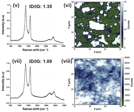 (a) Representative Raman spectrum, ID/IG intensity ratio, and corresponding (b) Raman imaging mapping, performed using the G band intensity as the reference for the samples, for (i,ii) 0.01-GO; (iii,iv) 0.01-GO-EDA; (v,vi) 0.1-GO; and (vii,viii) 1.3-GO.