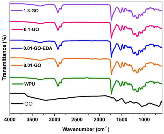 FTIR spectra of GO, WPU resin, and all concentrations of GO incorporated into the WPU resin.