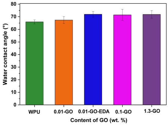 Figure 5 shows the results of the static contact angle measurements used to examine the hydrophobicity of GO-WPU coatings applied on carbon steel sheets. The waterborne polyurethane resin without GO already exhibits an intrinsic low hydrophobic character. Nevertheless, the incorporation of GO increased the contact angle, hence increasing the hydrophobicity of the coating. This improvement is primarily due to the graphitic structure of GO, which produces a higher hydrophobic surface, in comparison with the pristine WPU surface, that resists water spreading [24,59,60]. The increase in GO content from 0.01 to 1.3 wt%. increased the contact angle of the water on the WPU films from 67.35° to 71.82°, compared to 65.92° for the neat WPU. Song et al. found that the maximum water contact angle reached for 1.0 wt% GO was 55.38°, with flakes measuring 105.42 nm on average. In our study, the GO flakes possess an average size of around 25 µm, which may contribute to the enhanced contact angle due to improved hierarchical surface structures and roughness in the coating [21,24]. Additionally, Song et al. reported that an optimal GO content in WPU up to 0.5 wt% could prevent GO agglomeration in the resin [8]. In the present work, the coatings with the lowest concentration studied (0.01 wt% GO) and functionalized with EDA (sample 0.01-GO-EDA, in Figure 5) demonstrated the highest contact angle (71.92°). This can be attributed to the chemical functionalization and partial reduction of GO through its reaction with EDA. The carboxyl and epoxy groups of GO react with the amine groups of the EDA molecule, promoting the mild reduction in GO and improving the hydrophobicity of the surface [57]. This enhancement in hydrophobicity is a critical aspect of achieving high anticorrosion properties [8,22]. Reducing water permeation through WPU represents one of the biggest challenges in using this polymer to develop coatings with barrier properties [16]. In this work, we achieved promising results using a low content of GO (only 0.01 wt%) due to the combination of the sizeable lateral size of the sheets and the functionalization with EDA.