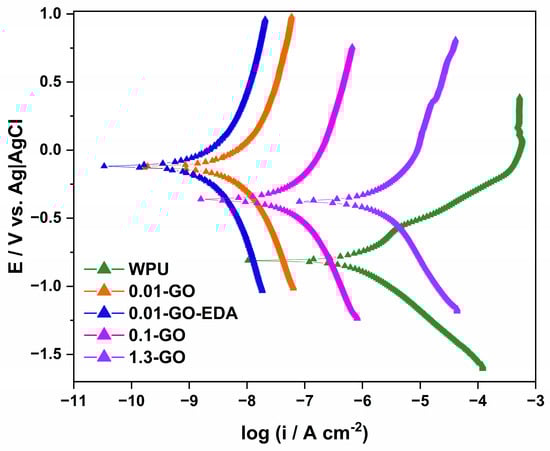 Potentiodynamic polarization curves were measured for all studied conditions to evaluate the effect of GO incorporation on the anticorrosive performance of coated carbon steel in a 3.5% NaCl solution. The results are illustrated in Figure 6.