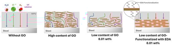 Schematic illustration depicting the effect of different contents of GO and EDA-functionalized GO on the barrier protection of the coating.