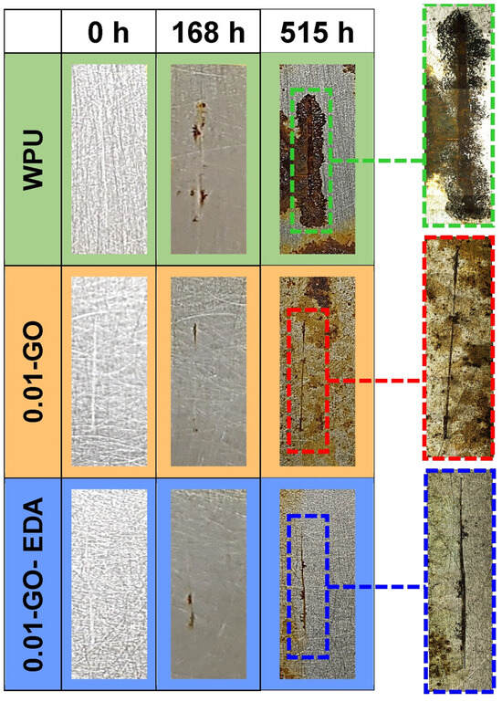 Figure 8 shows the surface morphology of the coated samples with artificial defects after 168 h and 515 h of exposure to a UV/condensation test. As observed in the images, prior to the accelerated aging test, the coated samples showed the characteristic brightness of WPU resin. Duong et al. reported that after 216 h of UV/condensation testing, polyurethane coatings (solvent-based) without GO degraded with loss in gloss, suggesting UV radiation-induced degradation. However, samples containing 0.01 wt% GO exhibited less gloss degradation. This can be attributed to the properties of GO in absorbing UV light, increasing the UV durability of the polyurethane coating [12]. In our study, after 515 h of exposure, we observed that the pristine WPU resin lost its brightness, while the 0.01-GO-EDA formulation exhibited less degradation, highlighting the beneficial role of the functionalized EDA-GO even at low concentrations. Furthermore, the involvement of EDA in creating a more compact cross-linking matrix and hydrophobic surface, contributes to a slower degradation of the film than using pristine WPU resin [49,50]. The evaluation of brightness in the 0.01-GO sample was complex because of the presence of corrosion products developed on its surface, likely caused by GO agglomeration that created preferential pathways through the coating to the metal, thereby triggering premature corrosion. In contrast, the 0.01-GO-EDA sample revealed a small quantity of formation of cracks in the resin after exposure, indicating that aggressive species did not easily penetrate the coating. This finding confirms that the functionalization of GO with EDA not only enhanced the formation of a dense three-dimensional network but also improved the dispersion of GO in the coating and the hydrophobicity of the coating surface, as illustrated in the schematic representation of Figure 7.