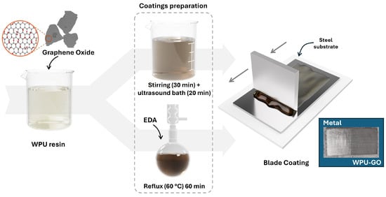 The graphene oxide/waterborne polyurethane (GO/WPU) composite coating was prepared by uniformly dispersing GO in the resin. The procedure can be observed in Figure 9. After adding the GO to the WPU resin, it was subjected to magnetic stirring for 30 min, followed by sonication on an ultrasound bath for 20 min at 37 kHz.