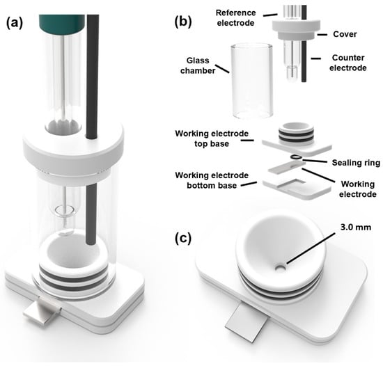 (a) Schematic diagram of a three-electrode cell used for electrochemical testing, (b) components of the cell, and (c) description of the cell base showing the test area for the samples.