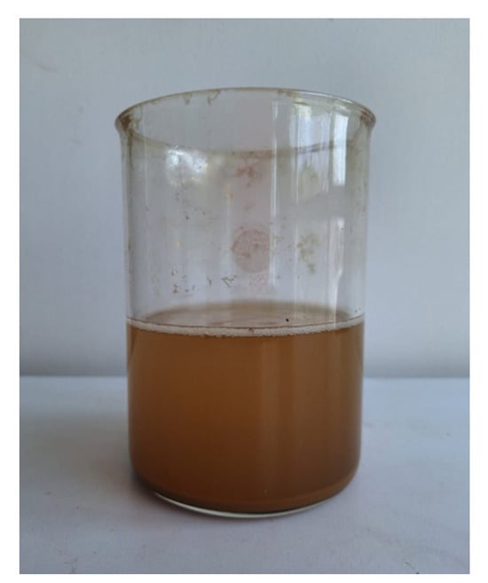 The observed behavior in yield and purity in terms of pyrolysis time and temperature may be because at low temperatures, complete carbonization does not occur, so the amount of burned material is lower and therefore, a higher yield is obtained because there may be uncarbonized remaining material. Thus, the purity of the carbonaceous material tends to be lower at low pyrolysis temperatures. At higher temperatures (between 700 and 1000 °C), all the material and the substances that compose it are carbonized, resulting in greater purity, but lower yield. On the other hand, time does not show an appreciable effect on yield or purity at low temperatures. At low temperatures, incomplete pyrolysis occurs and is reached quickly, so it is not significantly affected by extending the time. At temperatures above 700 °C, longer pyrolysis times are necessary because a more complete carbonization and thermal degradation develop, thus being affected by the time used in the process. The optimization model aimed at maximizing the yield and purity of Py-DCNS yielded an optimal temperature of 950 °C and an optimal pyrolysis time of 1.8 h with an R-sq of 94.2%. Under these conditions, a yield of 29.09% and an estimated purity by correlation of 82.55% were obtained. The Py-DCNS was washed to remove impurities from the pyrolysis process and purity values of approximately 91.9% were achieved. Using the modified Hummers method, the carbonaceous material (Py-DCNS) was generated from this optimization process at 950 °C and 1.8 h synthesize graphene oxide (GO-DCNS). Figure 2 shows an image of the GO-DCNS obtained through the synthesis process and dispersed in water by ultrasonication. As mentioned above, the yield of the carbonization process was 29.09%; 0.2909 g of carbonaceous material (Py-DCNS) were produced from one gram of deoiled shell (DCNS). On the other hand, 0.9091 g of GO-DSCN were produced from one gram of carbonaceous material, which reflects a yield of the synthesis process of 90.91%. Thus, the yield of the process for obtaining GO-DCNS from the initial DCNS material was 26.29%, with an energy consumption of approximately 0.48 kWh per gram of GO-DCNS.