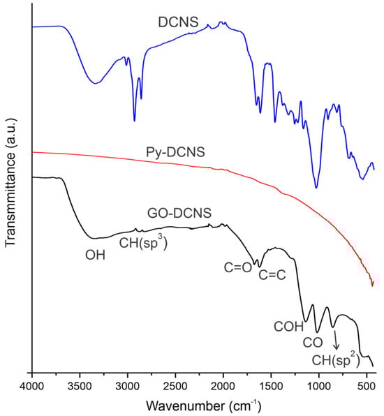 The structural changes that occurred during the transformation of DCNS to Py-DCNS and during the conversion of Py-DCNS to graphene oxide (GO-DCNS) were analyzed by FTIR spectroscopy. In Figure 3, the FTIR spectra of DCNS, Py-DCNS and GO-DCNS are presented and the bands observed in the spectra corresponding to the characteristic vibrations of each one is summarized in Table 1.