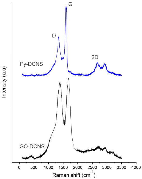 The relationship between D and G bands has been widely recognized as a method to elucidate the structural organization of carbonaceous materials [44]. Thus, the observed differences are accompanied by the increase in the ratio of intensities in the D and G bands (i.e., ID/IG), which for Py-DCNS is 0.34 and 0.98 for GO-DCNS, indicating a reduction in the size and crystallinity of the carbonaceous material due to oxidative chemical transformation and layer separation. This is consistent with previously reported findings [45].