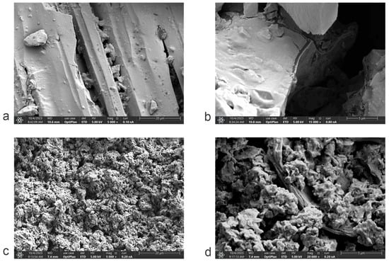 The microstructure of the carbonaceous material produced by the pyrolysis of deoiled cashew nut shells (Py-DCNS) and the graphene oxide synthesized from it (GO-DCNS) was analyzed by scanning electron microscopy (SEM) at two magnifications of 5 k and 20 k. The micrographs of Py-DCNS are presented in Figure 6a (5 k) and Figure 6b (20 k) and those of GO-DCNS in Figure 6c (5 k) and Figure 6d (20 k). The micrographs show a morphological difference between Py-DCNS and GO-DCNS. The carbonaceous material obtained from the pyrolysis of the deoiled shell shows at 5 k magnification, a characteristic shape of wide and coarse particles with a compact structure and sharp corners. While at 20 k magnification, a lamellar morphology indicating a layered structure in Py-DCNS is visible. On the other hand, the 5 k micrographs of graphene oxide show a change in morphology generated by the chemical transformation process of oxidation and generation of functional groups with oxygen and exfoliation promoted by the application of ultrasound, with a smaller particle size and aggregates. The magnification at 20 k allows us to appreciate a porous structure with sheets with roughness produced by possible distortions of the graphene sheets during oxidation; the stabilization of the atomic arrangement at the edges of the sheets forms the wrinkles.