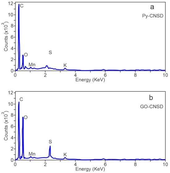 EDX spectra (a) Py-DCNS and (b) GO-DCNS.