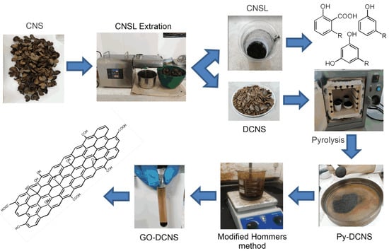For the synthesis of graphene oxide, 5 g of DCNS were taken, and the modified Hummers method was used, which consisted of adding 50 mL of sulfuric acid and 1 g of sodium nitrate and kept under constant stirring for 30 min in an ice bath. 3 g of potassium permanganate were added and stirring was continued for 3 h. The ice bath was then removed and stirring was continued for 1 h at 35 °C. Deionized water (50 mL) was then added and stirred for 1 h, maintaining the temperature at 100 °C, then stopping the heating and adding 100 mL of deionized water. The mixture was allowed to rest for 15 min and 10 mL of 30% hydrogen peroxide were added. The mixture was allowed to rest for centrifugation to obtain the graphene oxide precipitate. The mixture was then washed with ultrapure water and dried in an oven at 100 °C for 24 h. Figure 8 shows a diagram of the cashew nut shell transformation process from the moment it enters the laboratory. The diagram shows the different steps of mechanical and chemical transformation of the cashew nut shells until they are converted into graphene oxide.