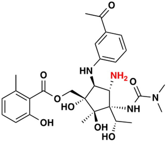 - ((1S,2R,3R,4S,5S)-5-((3-acetylphenyl)amino)-4-((S)-2,6-diaminohexanamido)-3-(3,3-dimethylureido)-1,2-dihydroxy-3-((S)-1-hydroxyethyl)-2-methylcyclopentyl)methyl 2-hydroxy-6-methylbenzoate (D1): 92%; Rf (DCM/MeOH/NH3: 9:1:0.1) 0.12; HR-ESI: m/z 687,3745; [M + H+] for the compound C34H51N6O9 requires 687.3712; 1H NMR (CD3OD) δ 7.20–7.15 (m, 3H), 7.07–7.04 (m, 2H), 6.67 (d, J = 6 Hz, 1H), 6.61 (d, J = 6 Hz, 1H), 5.13–5.09 (m, 3H), 4.83–4.79 (m, 3H), 4.46 (d, J = 12 Hz, 1H), 3.94–3.89 (m, 3H), 3.35–3.33 (m, 4H), 3.21–3.15 (m, 3H), 2.43 (s, 3H), 2.24 (s, 6H), 1.52 (s, 6H); 13C NMR (CD3OD) δ 202.3, 171.7, 150.1, 141.8, 139.5, 134.3, 131.0, 130.3, 129.6, 124.1, 120.6, 118.5, 116.1, 112.6, 84.2, 79.5, 74.6, 69.6, 68.2, 66.6, 60.4, 55.4, 42.0, 33.6, 27.6, 24.5, 23.7, 22.9, 18.8, 17.5, 15.3.