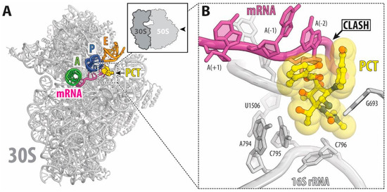 This PCT specificity has been confirmed by demonstrating that in vitro translation was arrested at preferential sites, which varied among the different mRNA templates used [11]. PCT could readily inhibit translocation of the ribosome carrying initiator tRNAfMet in the P site and the peptidyl-tRNA mimic, N-Ac-Lys-tRNALys, or N-Ac-Val-tRNAVal in the A site. However, when a similar complex was carrying deacylated initiator tRNAfMet in the P site, with the A site occupied by N-Ac-Phe-tRNAPhe, no inhibition of translocation was observed, even at elevated concentrations of PCT [7]. The term “context-specific” refers to this property, which is shared by many other ribosome-acting antibiotics. This viewpoint differs from the idea that antibiotics are general inhibitors that arrest genes equally efficiently at every codon but inhibit differently based on mRNA sequencing and the substrates that are bound to the ribosome [12]. Even without considering the contribution of the ribosome-associated nascent proteins and mRNA structures, which change as the ribosome moves from codon to codon, the variety of ribosomal complexes potentially available in the cell to interact with an antibiotic is enormous. The effect of PCT at the genome-wide level and the molecular mechanisms responsible for the site-specificity of the drug action are yet to be investigated [13]. The binding site of PCT on the T. thermophilus ribosome has been determined by X-ray crystallography [6,8,14], and according to the data, PCT occupies the E-site of the 30S subunit and prevents translocation. This interaction is illustrated in Figure 2, showing the ribosomal complex of T. thermophilus with mRNA, tRNAS, and PCT [8]. The structure indicates that PCT stacks on nucleotide G693 of 16S rRNA and shifts mRNA out of its usual location in the E-site of the small subunit, thus disrupting mRNA’s interactions with the E-site tRNA.