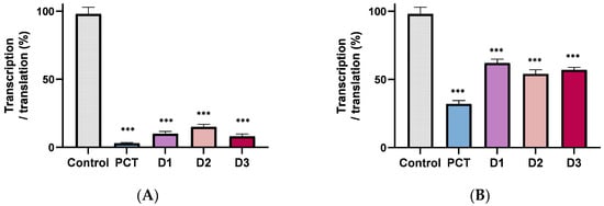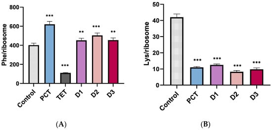 The next in vitro assay was aimed at examining polymerization, namely poly-Phe and poly-Lys formation [7]. Ribosomes were programmed with poly (U) or poly (A), the responsible codons for phenylalanine and lysine incorporation, respectively. According to Figure 4A, poly-Phe formation is not inhibited, but poly-Lys (Figure 4B) is strongly inhibited. The findings in both situations are expected because it has been shown in earlier studies that PCT suppresses poly-Lys but not poly-Phe [7].