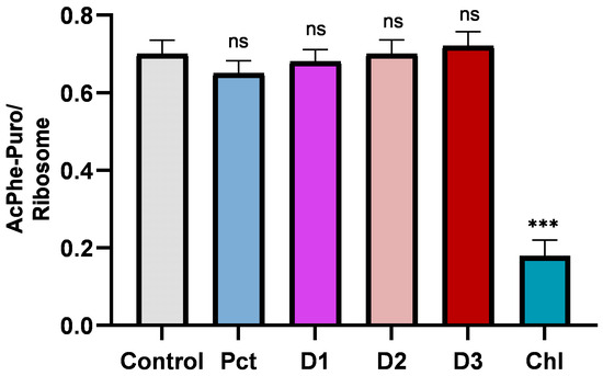 Puromycin reaction in the absence and presence of antibiotics at 10 μΜ concentration. Chloramphenicol (CHL) is used as a positive control that is known to occupy the A-site of the ribosomal large subunit and inhibit peptidyltransferase activity. Asterisks indicate level of statistical significance: *** p ≤ 0.001. ns: not significant changes.