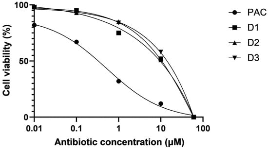 Resazurin assay. The compound’s toxicity was tested by measuring the viability of HeLa cells, after 16 h incubation with each antibiotic at various concentrations.