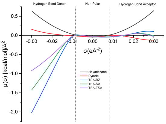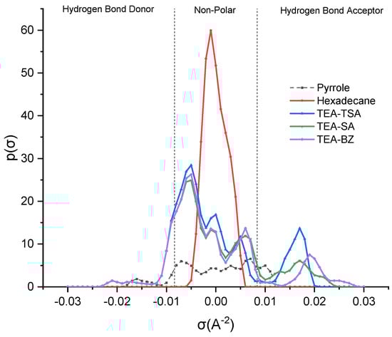 Based on the figure above, it is evident that the polarity of hexadecane is non-polar, stemming from its symmetric and linear structure, as well as the nature of carbon–carbon and carbon–hydrogen bonds [15]. Next, pyrrole demonstrates the ability to act as both a HBA and a HBD; thus, it can donate a hydrogen atom from the hydrogen attached to nitrogen and accept hydrogen bonds with its lone pair of electrons, but the prominent peak (−0.01821 e·Å−2) indicates the fact that it acts as an HBD compared to HBA (0.01337 e·Å−2). Thus, in order to interact with pyrrole, the PILs should exhibit both capabilities. In reviewing the PILs, it becomes evident that they have the potential to function as both a HBD and a HBA. Nevertheless, the prevailing trend leans toward HBA, likely influenced by the negative charge present on the sulfonate group and carboxylate group [14]. Furthermore, TEA-BZ appears more polarized compared to TEA-TSA and TEA-SA, suggesting a higher capacity to extract pyrrole. This shows that anions play a pivotal role compared to cations, which can be proven in the sigma profiles in Supplementary Materials, supporting the notion that the distribution peak of TEA predominantly falls in the non-polar region, with only a marginal presence in the hydrogen bond donor (HBD) area, indicating that TEA forms weak hydrogen bonds with pyrrole. In contrast, the anion is more polarized in the hydrogen bond acceptor (HBA) zone, forming stronger hydrogen bonds and significantly improving the extraction process.