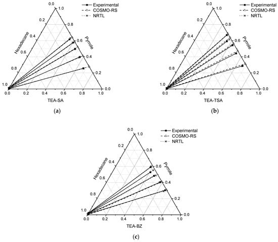 Tie lines for the ternary systems: (a) TEA-SA (1) + pyrrole (2) + n-hexadecane (3), (b) TEA-TSA (1) + pyrrole (2) + n-hexadecane (3) and (c) TEA-BZ (1) + pyrrole (2) + n-hexadecane at T = 298.15 K and 1 atm.