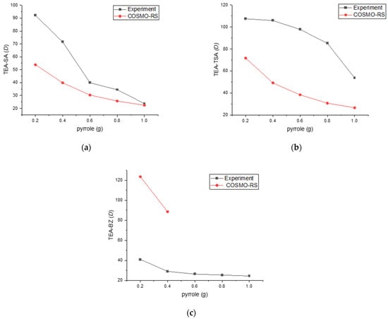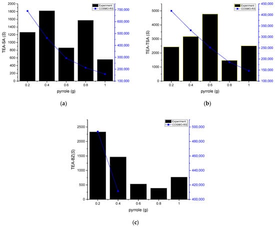 As displayed in Figure 4, the experimental distribution ratio for the TEA-TSA and TEA-SA systems was higher as compared to COSMO-RS prediction, while TEA-BZ was shown to be different and failed to predict its D in 0.6–1 g of pyrrole concentrations. The arrangement of D values for pyrrole, based on the solvent employed, is as follows: TEA-TSA > TEA-SA > TEA-BZ. The high value of D for TEA-TSA is due to the size of the anion, which causes less steric hindrance, resulting in an ease in the mobility of pyrrole in binding with the PILs. In addition, the low correlation of prediction between COSMO-RS and experimental data in the distribution ratio or even in the tie line could be the parameter limitation. This is because the accuracy of COSMO-RS predictions depends on precise parameterization, such as dielectric constants and surface areas, which may not perfectly reflect the actual experimental condition. This assertion can be supported by a previous study by Wang et al. (2014); in predicting LLE in systems containing DES, the use of TZVP and TZVP FINE parameters shows that COSMO-RS is more effective in describing the non-ideal behavior of systems containing alcohols compared to those with aromatics and cyclic compounds, likely due to the intricate interactions present in aromatic and cyclic systems [17]. It can be observed that COSMO-RS qualitatively predicted similar trends of correlation between the distribution ratio and the molar composition of pyrrole.
