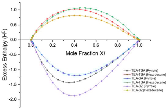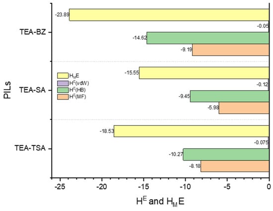 Based on Figure 6, it is demonstrated that the negative excess enthalpy observed when pyrrole is dissolved in a PIL compared to hexadecane indicates that the interactions between pyrrole and the PILs are more energetically favorable in the order of TEA-BZ > TEA-TSA > TEA-SA. This suggests that there are specific attractive interactions between the pyrrole molecules and the ions present in PILs. These interactions could include hydrogen bonding between the PILs and pyrrole molecules, which contribute to the stabilization of the mixture. Conversely, the positive excess enthalpy observed when pyrrole is dissolved in hexadecane suggests that the interactions between pyrrole and hexadecane are less favorable than expected. This could be due to differences in the polarity and molecular structure between pyrrole and hexadecane, leading to weaker interactions compared to those in PILs. This assertion can be proven in Figure 7; when the excess enthalpy (HME) of pyrrole in PILs shows a negative value, this signifies an exothermic process, indicating that the dissolution of pyrrole in PILs is favorable [25]. The histogram depicted in Figure 7 illustrates that the hydrogen bond interaction energy between PILs exerts a more significant influence on the dissolution capability of pyrrole in PILs, followed by misfit and van der Waals interactions, with an order of TEA-BZ > TEA-TSA > TEA-SA. The strong hydrogen bonding between TEA-BZ and pyrrole can be proven through the sigma profile in which TEA-BZ is more polarized as compared to other PILs. Indeed, it can be inferred that anions play a crucial role in the extraction of pyrrole.
