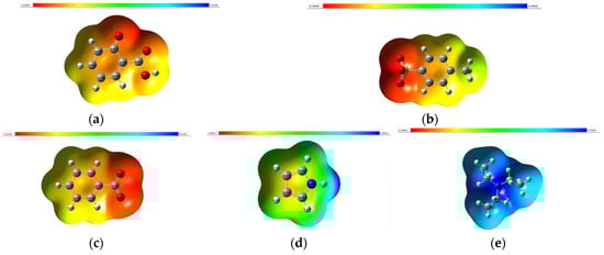 Electrostatic potential surfaces of anion: (a) SA, (b) TSA (c) BZ, (d) pyrrole and (e) TEA optimized at the B3LYP/6-311G + (2d,p) level.