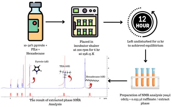 The feed mixture was meticulously prepared within a 20 mL screw-capped scintillation vial, utilizing an analytical balance with a precision of ±0.0001 g. This mixture comprised various weight percentages (10, 20, 30, 40 and 50 wt%) of pyrrole in hexadecane, with the total weight standardized to 2 g. Furthermore, an ionic liquid (IL) was added to each vial in a 1:1 mass ratio. To prevent any loss of components due to evaporation, the vials were tightly sealed with parafilm, and spring clamps were applied during the shaking process. Shaking was carried out at 200 rpm in an incubation shaker maintained at a constant temperature of 298.15 K and atmospheric pressure of 1 atm. The mixing duration was set for 6 h. Subsequently, after the 6 h mixing period, the system was left undisturbed for an additional 12 h to ensure that equilibrium was attained. The decision to wait for 12 h was based on a settling time study conducted to ensure full equilibration within this time frame. Figure 9 below illustrates a flow diagram of the experimental methodology.