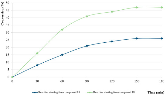 This latter reaction offered a possibility to compare the effect of the leaving groups on conversion (Figure 1). The reaction was monitored by TLC and NMR analysis of the crude reaction mixtures every 30 min. These systematic investigations allowed us to conclude that starting from precursor 18 the desired diaryl derivative was formed in higher conversion. This may be explained by the better leaving group character of L-proline compared with that of morpholine.
