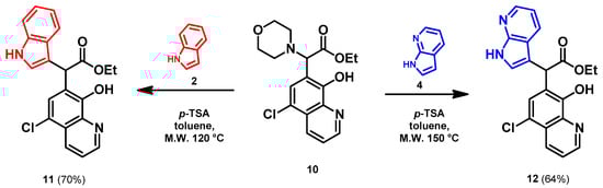 After introducing the newly synthesized precursor bearing the 8-hydroxyquinoline moiety, the preparation of 11 starting from 10 and indole (2) in the presence of 10 mol% p-TSA was accomplished (Scheme 4). In this case, 11 was isolated with a yield of 70% in 4 h at 120 °C. To study the scope and limitations of the reaction, the synthesis of 12 was planned through the reaction of the precursor 10 with 7-azaindole (4). The reaction was tested first in toluene at 120 °C by monitoring the conversion of the starting compounds by TLC analysis. Since the yield was not satisfactory, the reaction was repeated at 150 °C (Scheme 4). By using a higher temperature and a longer reaction time (3 h), the desired product was isolated by crystallization from the reaction mixture.