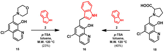 Since derivative 16 is postulated to be formed in the reaction of indole with ortho-quinone methide evolving from Mannich base 15, we carried out a systematic investigation of the synthesis of 16. According to previous observations, the amine moiety of the Mannich base can be interpreted as a leaving group. Consequently, two precursors have been selected. These were compound 15 bearing the morpholine skeleton and Mannich base 18 having the L-proline motif. This latter precursor was re-synthesized by using our synthetic pathway published earlier [21], starting from 5-chloro-8-hydroxyquinoline, L-proline, and aqueous formaldehyde. The parallel arylation of precursors 15 and 18 with indole was also investigated (Scheme 7).