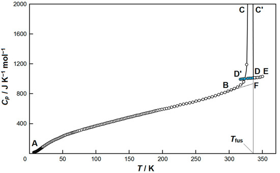 The heat capacity of [C4(MIm)2][NTf2]2 in the temperature range 6–350 K: Tfus is the temperature of fusion; ABF—crystalline state; DE—liquid state; DD’—supercooled liquid state (colored circles); BCC’D—an apparent heat capacity in the interval of fusion.