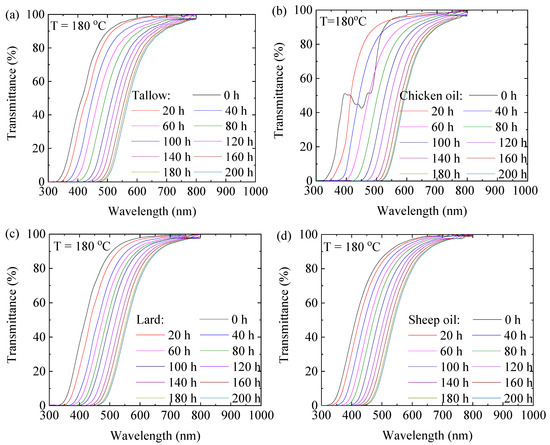 Figure 1 shows the transmittance spectra of the tallow, chicken oil, lard, and sheep oil at 180 °C in the wavelength range from 300 nm to 800 nm. The transmittance spectra of the tallow, chicken oil, lard, and sheep oil at 160 °C, 140 °C, and 120 °C are shown in Figures S1–S3 in the Supplementary Information. The transmittance for all the four animal oils decreases with the decrease in the wavelength and reaches 0% at the cutoff wavelength, and the transmittance spectrum undergoes a red shift with increases in the heating time. Such behavior is likely due to the changes in the chemical structures and/or chemical compositions, such as the formation and growth of color centers, during the heating process [23]. The largest red shift occurs at the highest temperature of 180 °C, revealing the temperature dependence of the changes in the chemical structures and/or chemical compositions.