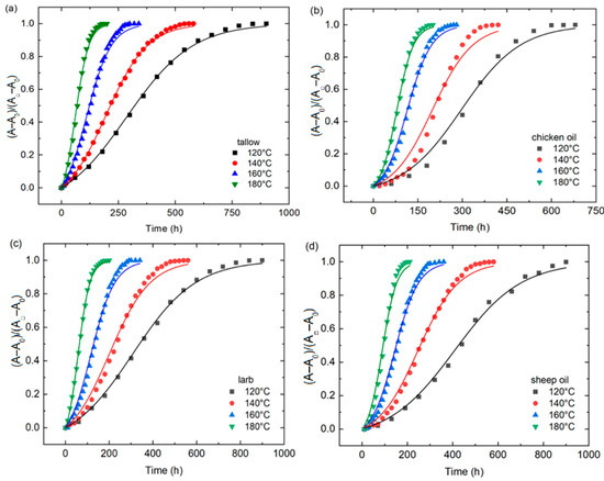 where is the absorbance at and is the absorbance at . Using Equation (3) to fit the data in Figure 2, we obtain the numerical values of the fitting parameter, , for the animal oils at different temperatures. For comparison, the fitting curves are included in the corresponding plots in Figure 2. It is evident that Equation (3) accurately describes the temporal evolution of the absorbance of the animal oils.