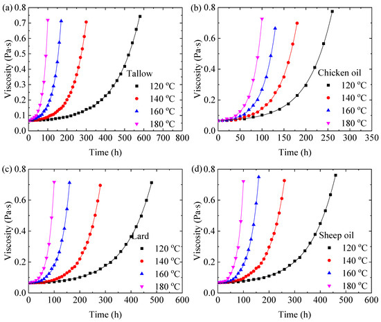 Temporal variations of the viscosities of the animal oils at different temperatures: (a) tallow, (b) chicken oil, (c) lard, and (d) sheep oil.