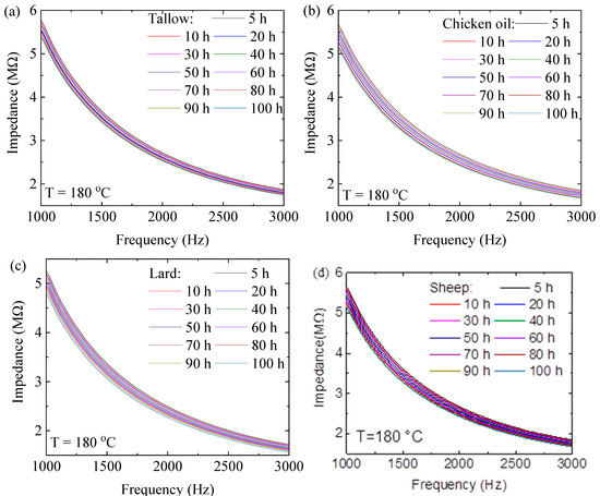 An LCR meter with an interdigital sensor of 100 µm of finger interspace was used to measure the variation in the electrical impedances of the animal oils in the frequency range from 1000 Hz to 3000 Hz. Figure 4 and Figures S5–S7 in the Supplementary Information show the frequency dependence of the electric impedances of the animal oils at different heating times at different temperatures. The electric impedance decreases nonlinearly with increases in the frequency under the same heating time at the same temperature for all the animal oils. At the same frequency and temperature, the electric impedance is a decreasing function of the heating time. Note that the electrical impedance of oils is a function of the fraction of the dipoles in the fat [25]. Increasing the fat content in an oil increases the fraction of dipoles and electric susceptibility. Thus, the decrease in the electric impedance is likely due to the increase in the dipoles with the increase in the heating time.