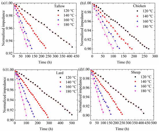 Using the results shown in Figure 4 and Figures S5–S7, we normalize the electric impedance at heating time t with the one at t = 0 h at the same temperature at the frequency of 1000 Hz. Figure 5 shows the temporal variation in the normalized impedance at different temperatures for the four different animal oils. Increasing the heating temperature causes the decrease in the normalized impedance. At the same heating time, the higher the heating temperature, the smaller the normalized impedance. Again, the results illustrate the dependence of the impedance on both the heating time and temperature.