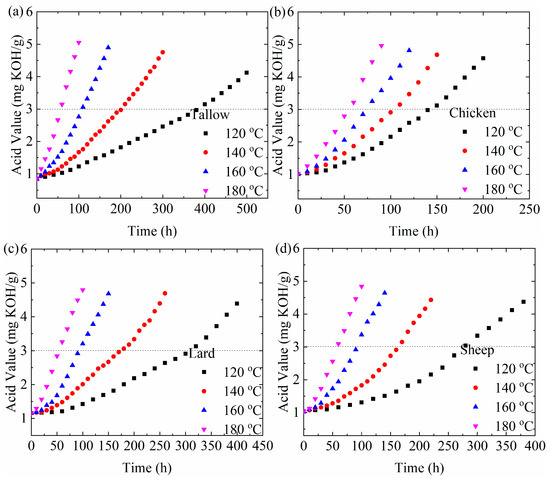Temporal evolution of the acid values of the animal oils at different temperatures: (a) tallow, (b) chicken oil, (c) lard, and (d) sheep oil.