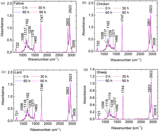 Animal oils with triglycerides as the main composition can undergo a cis-trans isomerization and produce isolated trans-fatty acids, which are suspected to cause arteriosclerosis and heart disease [24]. Also, animal oils can undergo oxidation and produce organic compounds including carboxylic acid and aldehyde [25]. Figure 7 shows the FTIR spectra of the animal oils for different heating times at 120 °C; enlarged views of the FTIR spectra are shown in Figures S8–S12 in the Supplementary Information. The FTIR spectra of the animal oils are highly similar. The main peak at 3010 cm−1 is associated with the C–H stretching vibration of a cis–double bond (–CH); the two sharp peaks at 2923 and 2852 cm−1 represent the symmetric and asymmetric stretching vibration of the aliphatic CH2 group, respectively. The sharp peak at 1747 cm−1 represents the ester carbonyl functional group of triglycerides; a peak at 1740 cm−1 represents the C=O stretching aldehyde. A peak at 1465 cm−1 is associated with the bending vibrations of the CH2 and CH3 aliphatic groups; a small peak at 1378 cm−1 represents the bending vibrations of the CH2 groups. The peaks at 1239, 1162, and 1098 cm−1 are related to the stretching vibration of the C–O ester groups. A peak at 1117 cm−1 represents aliphatic esters. A peak at 722 cm−1 is related to the CH2 rocking vibration and the out-of-plane vibration of cis-disubstituted olefins. All of the peaks are the same as the corresponding ones reported by Vlachos et al. [24].