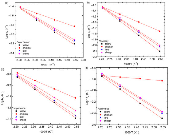 (a) Temperature dependence of for the animal oils, (b) temperature dependence of for the animal oils, (c) temperature dependence of bE for the animal oils, and (d) temperature dependence of log(1/tA) of acid value for the animal oils.