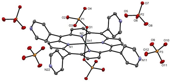 Among metalloporphyrins, Sn(IV)porphyrin compounds are ideal building block scaffolds for constructing coordination complexes [31,32], multiporphyrin arrays [33,34], and self-assembled nanostructures [35,36]. Oxophilic Sn(IV)porphyrin centers can readily accommodate two trans-axial oxyanion ligands (carboxylates and alkoxides), forming a rigid octahedral coordination geometry. Additionally, these complexes are diamagnetic, allowing structural details to be obtained from 1H and 119Sn nuclear magnetic resonance (NMR) spectroscopy [37]. Most importantly, the six-coordinate structure of Sn(IV)porphyrin complexes is advantageous for the self-assembly of tin porphyrin complexes because it allows the structural motifs to be extended into a multidimensional framework by utilizing various intermolecular interactions and different directions. Considering this structural feature, Sn(IV)porphyrin complexes can be recognized as molecular building blocks capable of multivalent interactions, which enable diverse and cooperative binding in supramolecular assemblies [38]. Previously, we crystallographically characterized the supramolecular ionic self-assemblies of highly charged tin(IV)porphyrin pyridinium cations stabilized by nitrate and sulfate anions [39,40]. These studies demonstrated that the axial ligands and counter anions of highly charged tin(IV)porphyrin cations play an important role in the supramolecular assembly together with the rigid structure of the porphyrin framework. In addition, Sn(IV)porphyrin cations assemble into different nanostructures depending on the counter anions and axial ligands [24]. The counter anions and axial ligands thus significantly control the morphology and photocatalytic properties of the nanostructures. From this perspective, we considered axial ligands and counter anions that may have multiple sites that can engage in intermolecular interactions, such as phosphate groups. The tetrahedral structure of the phosphate skeleton consisting of four oxygen atoms is useful for supramolecular assembly and the construction of robust nanostructures. Herein, we describe the synthesis, crystal structure, characterization, morphology, and catalytic performance of nanoaggregates of the Sn(IV)porphyrin-containing ionic complex [Sn(H2PO4)2(TPyHP)](H2PO4)4∙6H2O (2).