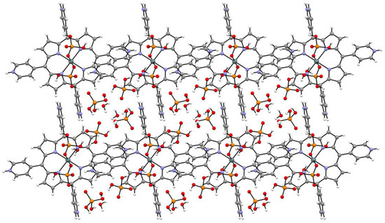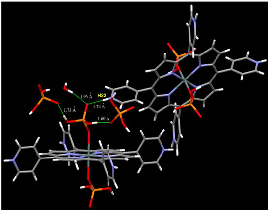The reaction of 1 with an aqueous solution of 1% nitric acid has been reported to generate hexa-cationic [Sn(OH2)2TPyHP]6+ species surrounded by six nitrate anions [39]. In that case, the pyridine groups as well as the axial hydroxyl groups were protonated to produce [Sn(OH2)2TPyHP]6+. It is a hexa-cationic species and was stabilized by six NO3− anions. In the unit cell of 2, the axial hydroxyl group was replaced by the phosphoric acid group to form tetra-cationic [Sn(H2PO4)2(TPyHP)]4+ species and stabilized by four H2PO4− anions. Also, six water molecules were present in the unit cell of 2. The Sn(IV) atom in complex 2 has an octahedral coordination environment as evident from the crystal lattice. The equatorial plane and axial positions are occupied by four N atoms from the porphyrin moiety and two O atoms from phosphoric acid groups, respectively. Both positions of the axial phosphoric acid group bonded with the tin(IV)porphyrin center are symmetrically equivalent. The bond distances of two symmetrically comparable Sn−N bonds were measured to be 2.0837(15) Å and 2.0800(15) Å, respectively. The average bond distance is marginally shorter than that of the [Sn(OH2)2TPyHP]6+ species (2.083 Å). On the other hand, symmetrically equivalent, axial Sn−O bonds were measured to be 2.0838(13) Å. The average axial Sn–O bond length is considerably close to that of [Sn(OH2)2TPyHP]6+. The axial dihydrogen phosphate ligand plays a pivotal part in the supramolecular assembly of tetra-cationic [Sn(H2PO4)2(TPyHP)]4+. The dihydrogen phosphate ligand acts as both a hydrogen-bond donor and acceptor, as evident from Figure 2.