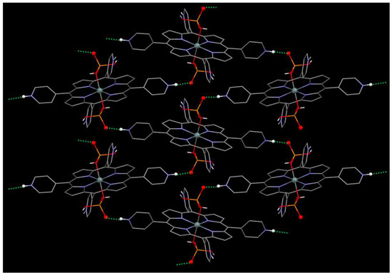 Hydrogen-bonded arrays of Sn(IV)porphyrin building blocks in 2. The green dotted lines represent hydrogen bonds. For clarity, H atoms bonded to C atoms are excluded.