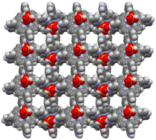 Space-filling representation showing the regular porous 1D channels in 2, viewed along the crystallographic b-axis. The anions and lattice solvent molecules are excluded for clarity.